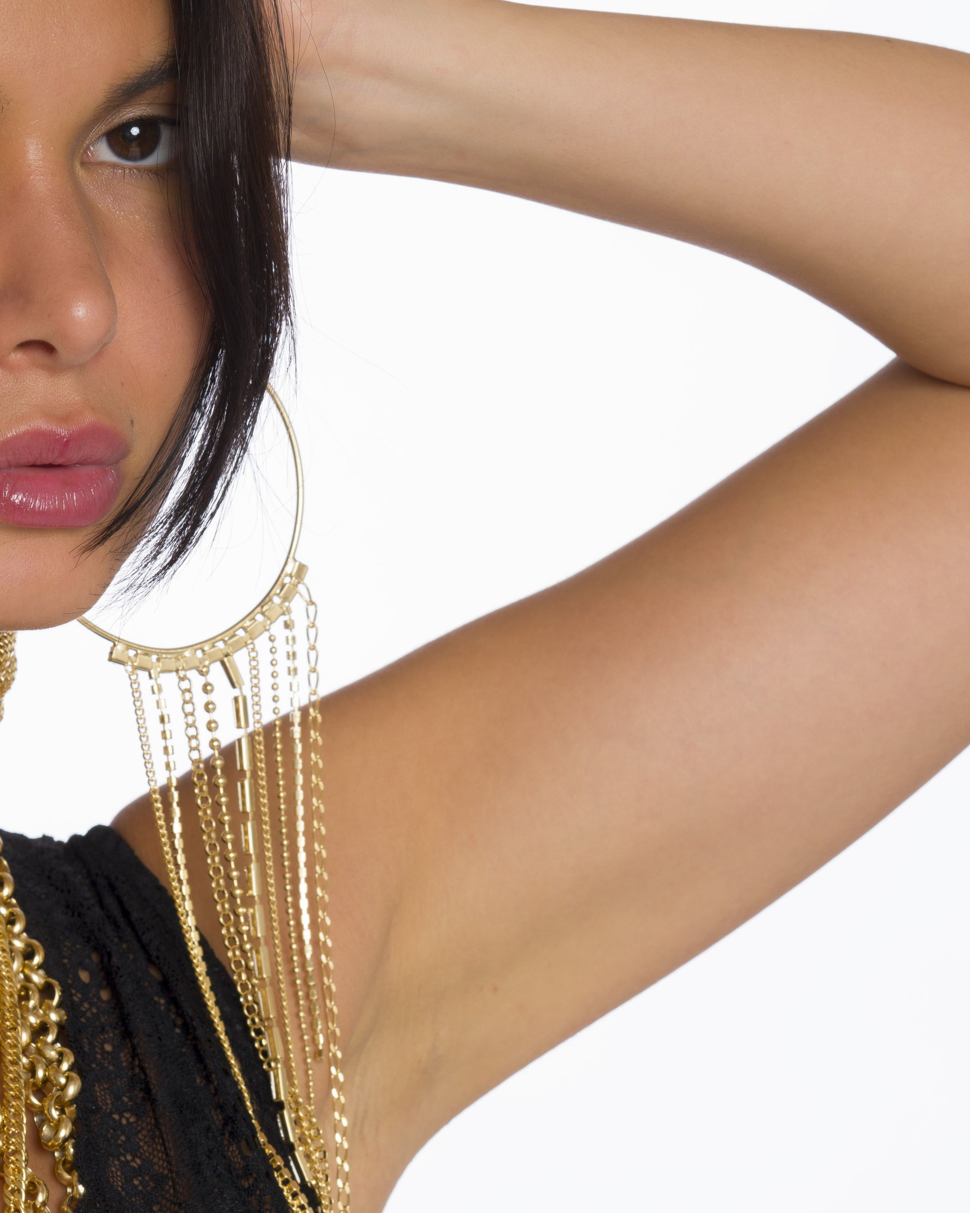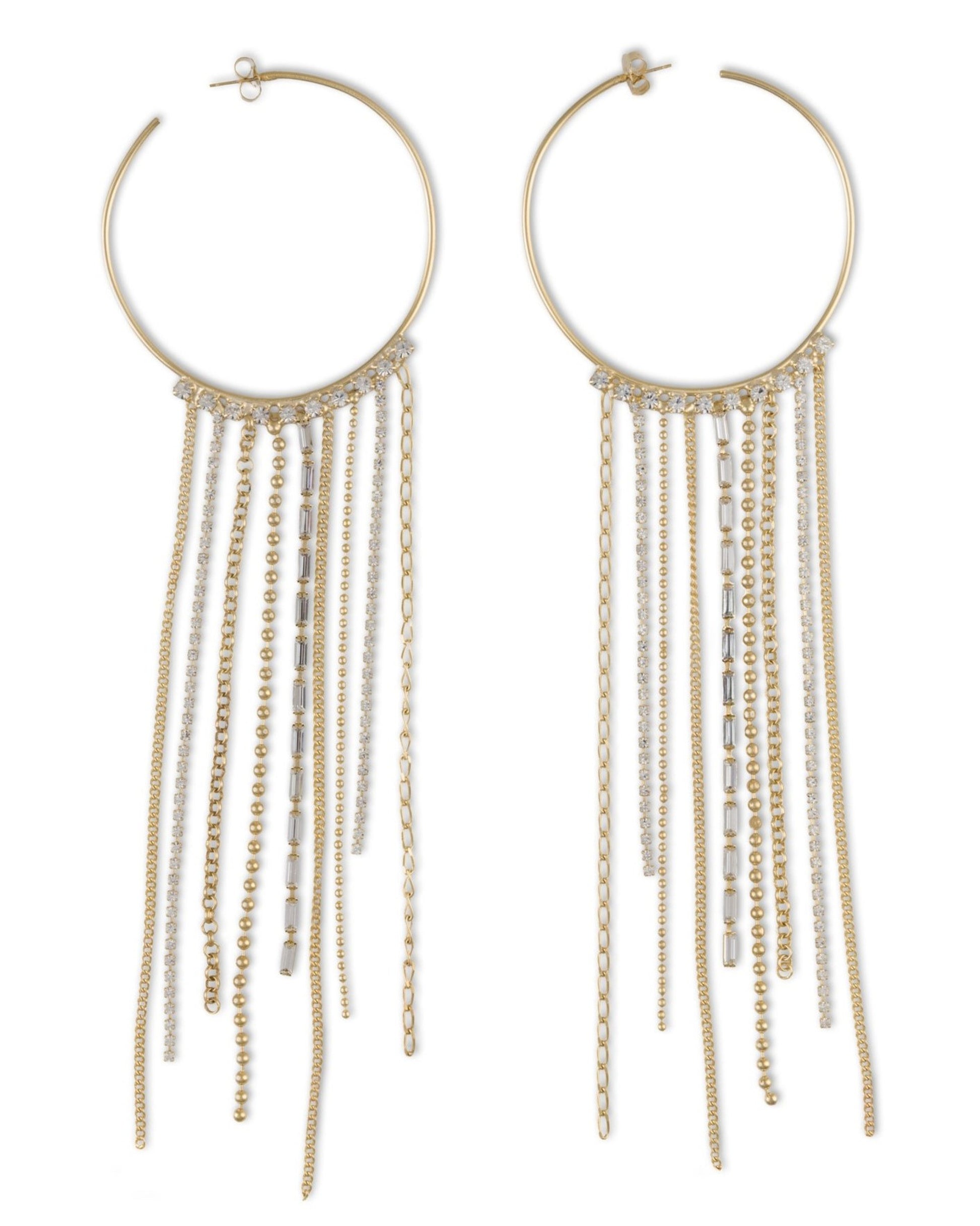 Cerchi in metallo finitura oro con fili pendenti alternati di catene e strass, che creano un movimento luminoso e sofisticato. Un gioiello scenografico, perfetto per aggiungere glamour a ogni outfit.