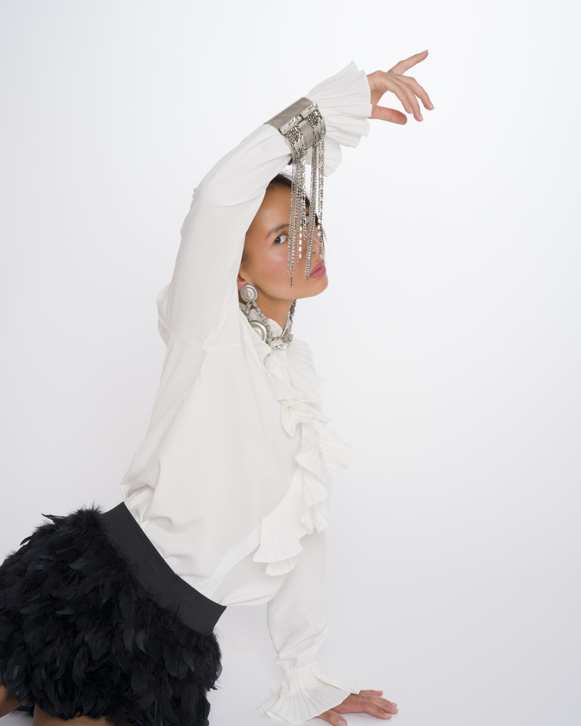 Bracciale a schiava in finitura argento, composto da molteplici fili di catena e strass pendenti. Lyrren è una cascata di luce e movimento, pensata per avvolgere il polso con eleganza e magnetismo. Ogni gesto diventa una coreografia scintillante.