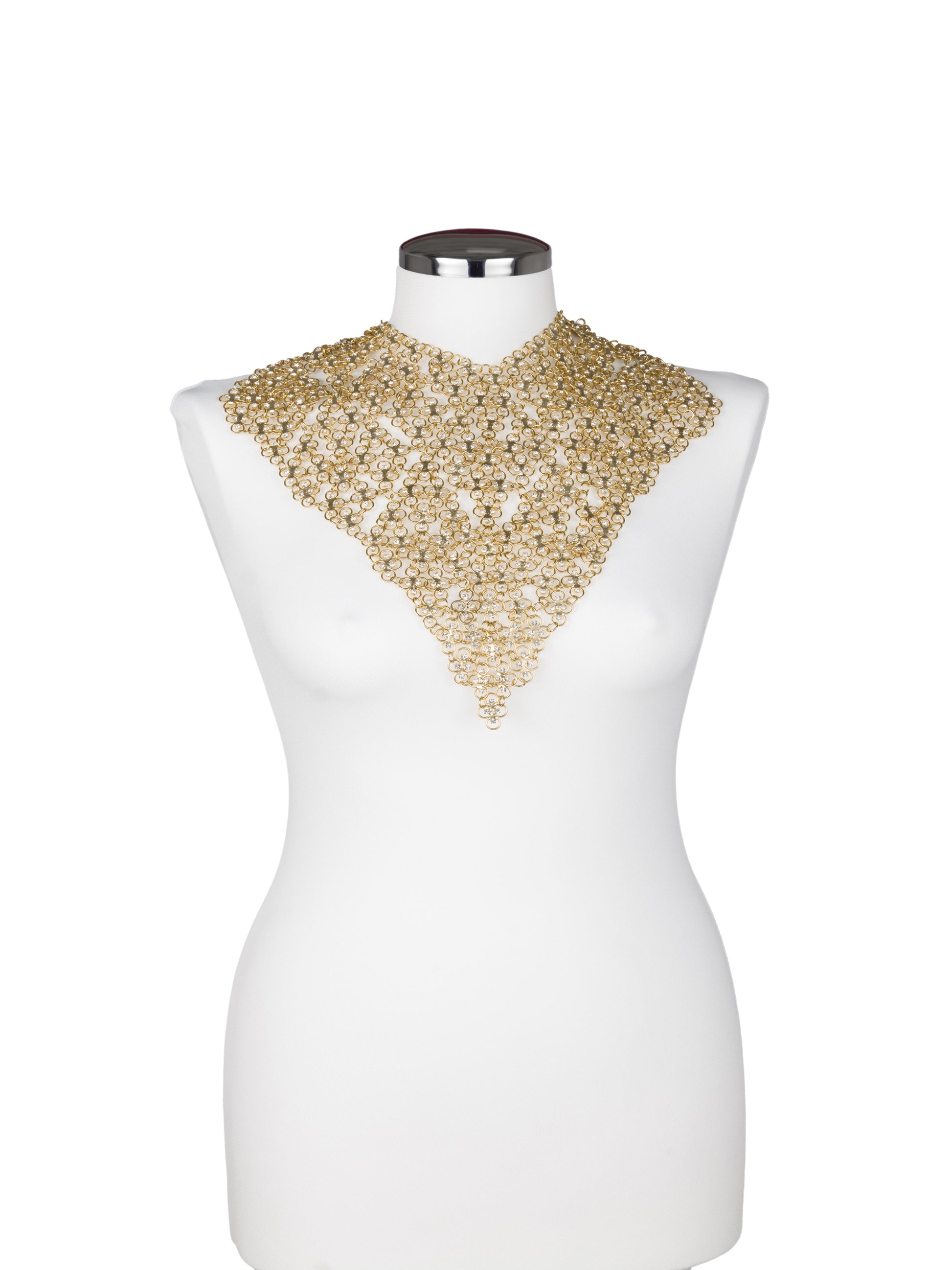 Body chain in finitura oro, progettata per adornare gran parte della scollatura con linee armoniose e piccoli inserti di strass che catturano la luce a ogni movimento. Un gioiello scenografico ma versatile, capace di esaltare tanto un abito da sera quanto un look casual ricercato.